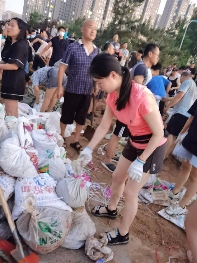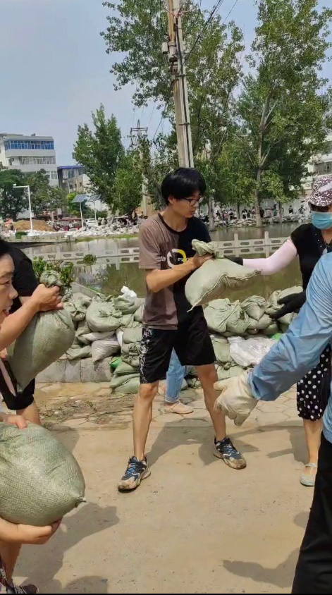 刘释心同学积极参与家乡防汛工作,于新乡市红旗区新中大道与中原路交叉口为堵水准备沙袋,传送沙袋。