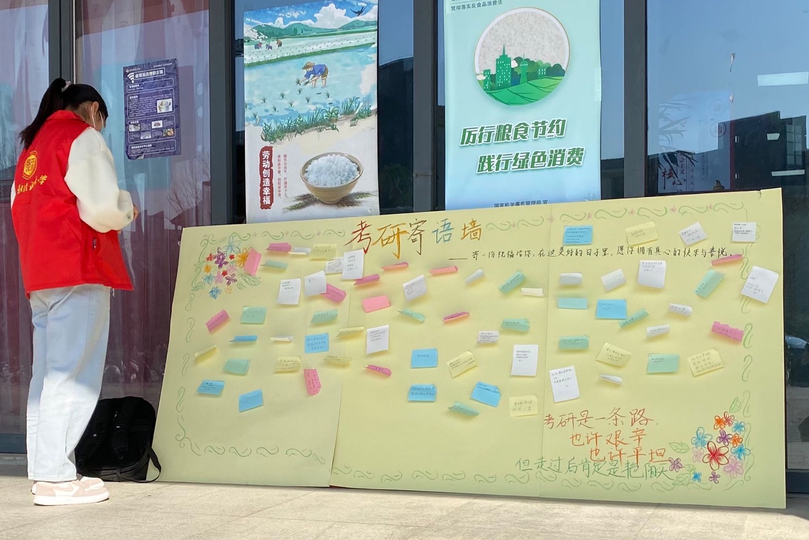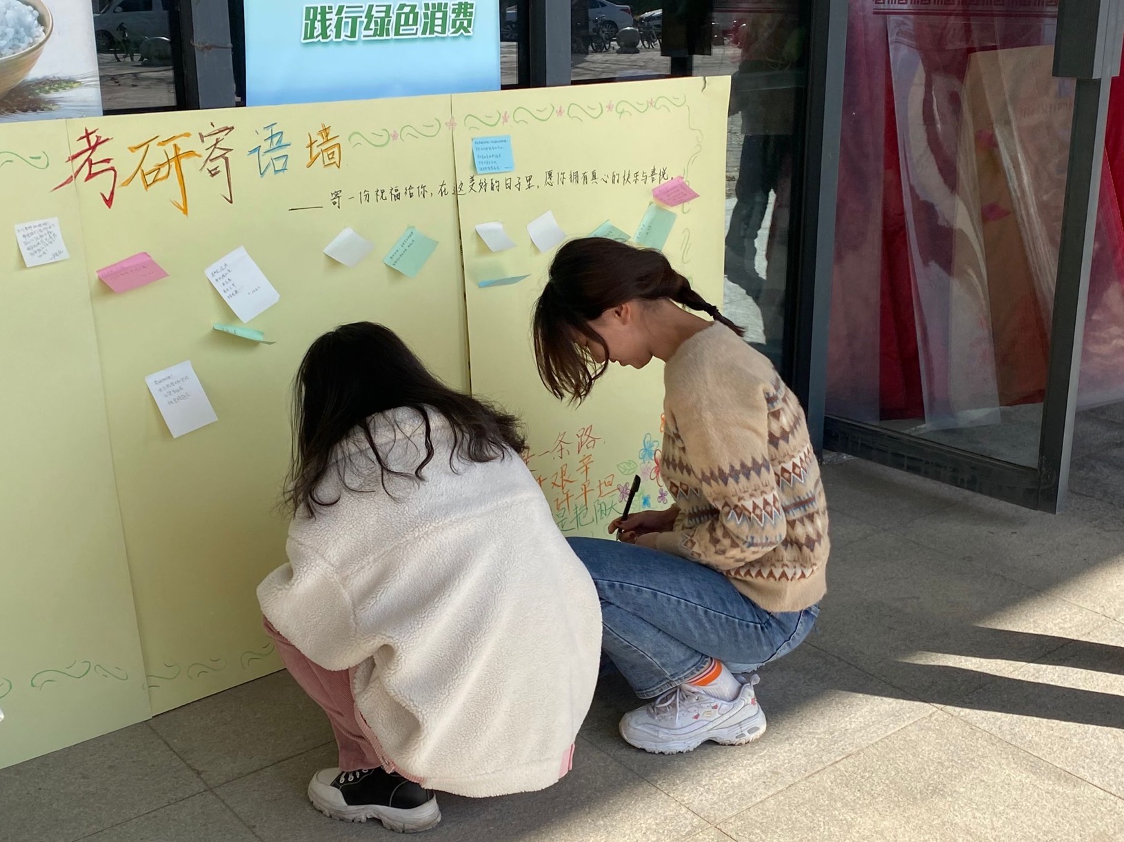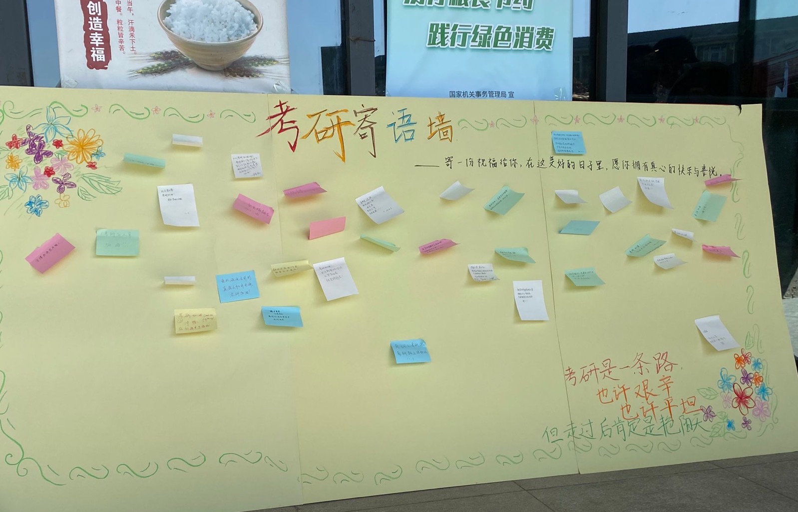 本次活动邀请老师和员工们为考研学子送上祝福语。这一张张小小的便利贴上承载的不仅仅是祝福,更是对考研学子的期望。考研学子在收到这些诚挚的祝福后会更加积极应对考研路上的种种磨难,对考研上岸更有信心。活动最后,国贸青年志愿者及国贸在校员工祝福考研同学能在最后关键时刻能心神气定,沉着应考,稳扎稳打,相信不负努力,终有回报。