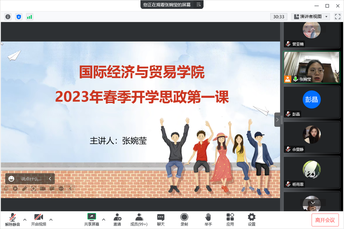 课程开始,辅导员张婉莹首先带领员工学习党的二十大报告中习近平总书记有关青年工作的重要论述,勉励青年老员工紧握新时代的接力棒,坚定自己的理想信念,立志做不负时代、不负韶华、不负党和人民的新时代好青年。在疫情防控教育方面,张婉莹讲述了这三年来国家为了抗疫所做出的努力以及抗疫成果,科普了新型冠状病毒感染实施“乙类乙管”的措施要求,提醒同学们要继续做好个人防护,提高应对春季各类流行病的能力。辅导员王雨薇从校园安全、纪律、卫生等方面对同学们提出了新学期的工作要求,并对近期电信网络诈骗案例进行分析,培养员工安全行为习惯,全面提高员工防范意识和防范能力。在心理健康教育方面,王雨薇向员工介绍了常见的心理问题及应对技巧,引导员工在出现心理问题后要及时向家长、老师反馈,积极调整恢复。最后,张婉莹对本次开学思政第一课进行总结,鼓励同学们以积极的面貌迎接新学期,创造新成绩。