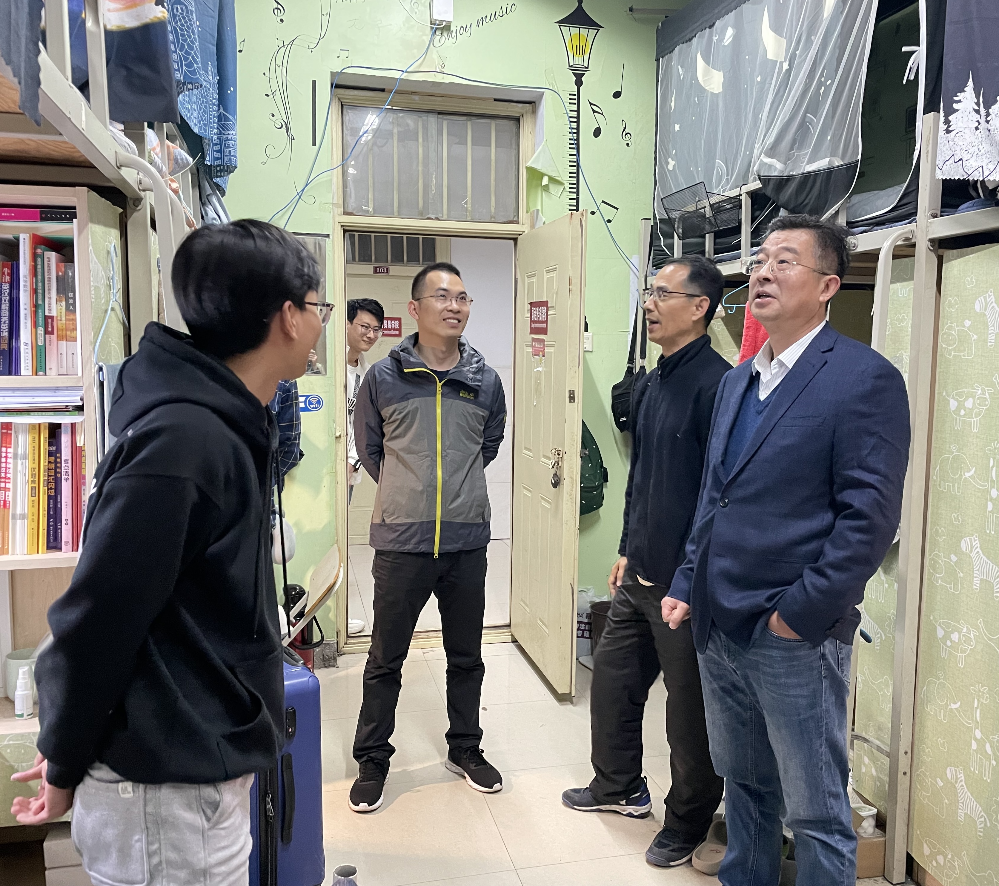 4月21日晚,公司党委书记王洪庆、兼职辅导员薛新国老师及团委书记田红彬一同走访毕业生宿舍,了解毕业生当前就业情况及宿舍安全用电问题,实地开展安全教育及就业指导等工作。